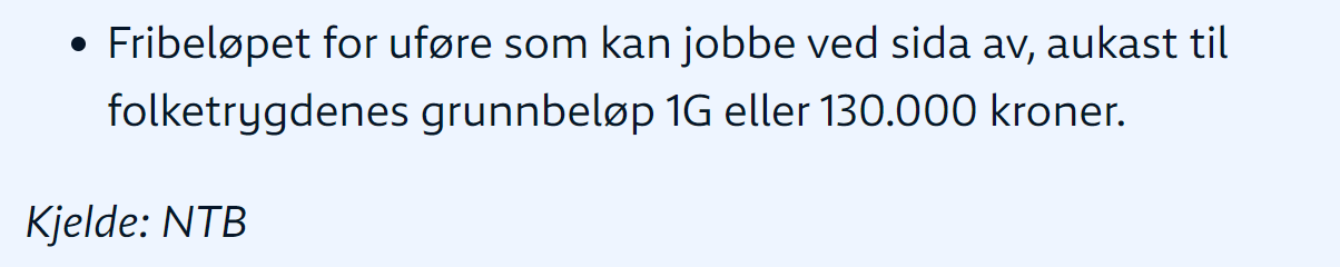 Å jobbe det man klarer, handler ikke bare om ekstra penger, men også om tilhørighet, mestring og mening. Jeg synes ordningen med fribeløpet på 0,5G var en fornuftig mellomting. 1G er for mye.