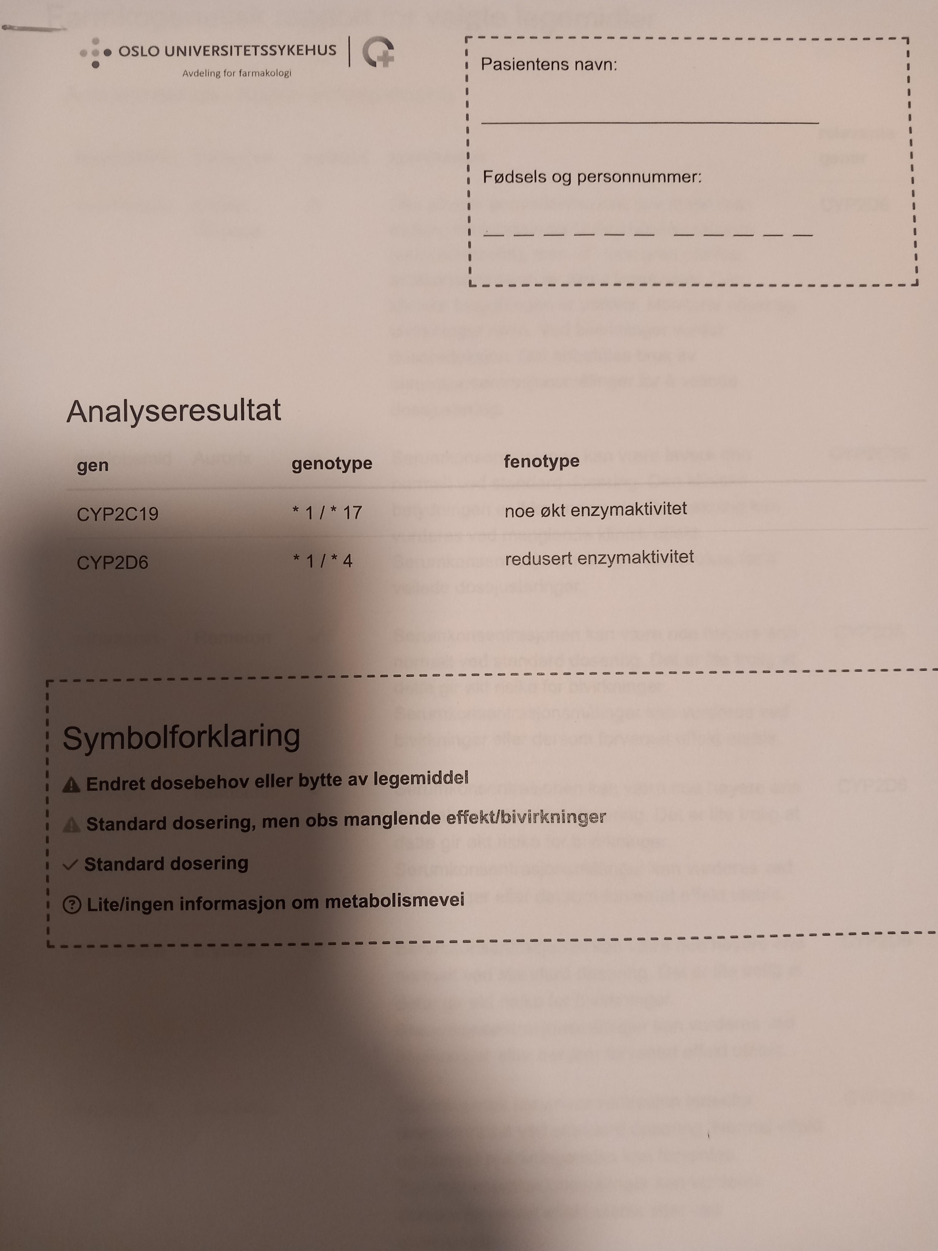 FjellOgDalar Skrevet torsdag kl 18:58 Skrevet torsdag kl 18:58 Det er bra dette ser ut til å gjøres oftere nå. Jeg hadde tilfeldigvis lest om det ett eller annet sted, og mistenkte at jeg kunne ha det fordi verken kodein (Paralgin F) eller tramadol (Nobligan) biter på meg. Likevel skrev jeg 2019 da fastlegen min foreslo å teste. Og ganske riktig, jeg har kraftig redusert CYP2D6. Om man ikke får tilfredsstillende effekt/mest bivirkninger av medisiner er det vel verdt å sjekke. 0 Siter