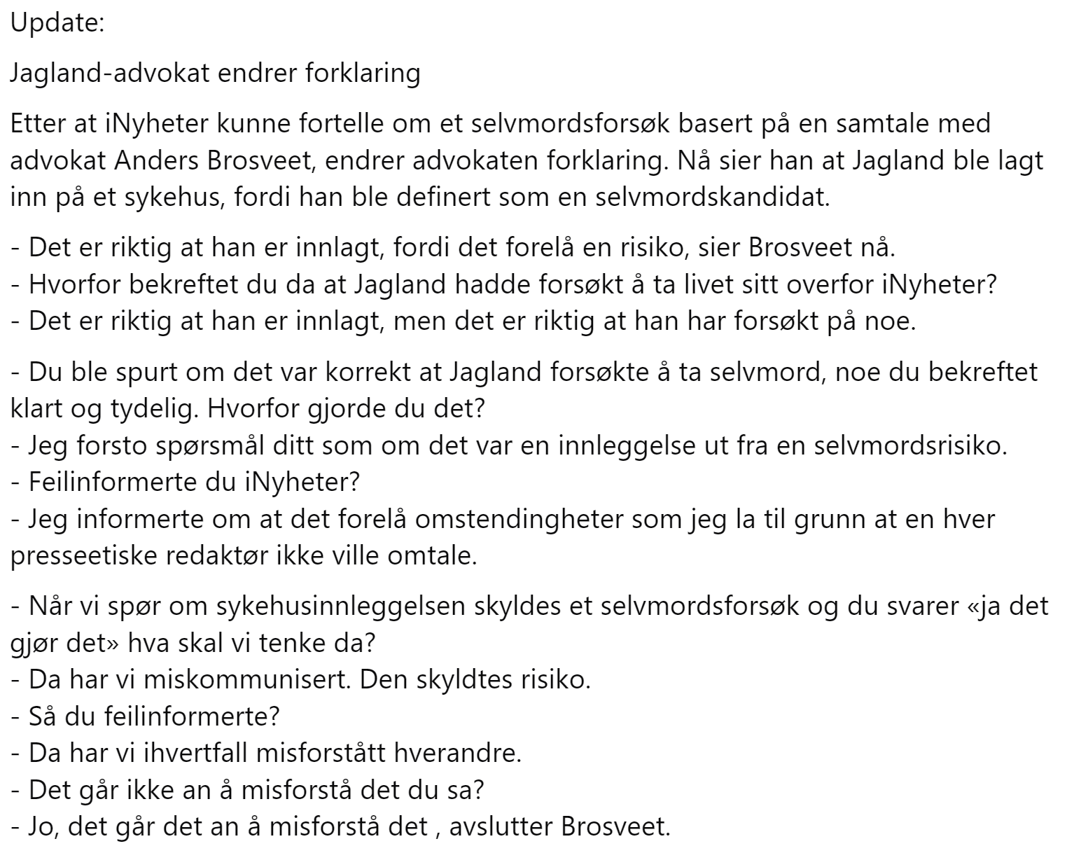 AnonymBruker Skrevet 24. februar Skrevet 24. februar 9 minutes ago, Worriesome Plenty 2 said: https://www.vg.no/nyheter/i/m0Q114/thorbjoern-jagland-innlagt-paa-sykehus ikke selvmordsforsøk. Kommunikasjonssvikt mellom advokat og journalist? https://www.facebook.com/jarle.aabo/posts/pfbid0i9CXo9nwyvhii6VKaUSEiyALvMZoCEC3qqTDAKbxQgUM916N1Jq9S73QMqEquCyDl Anonymkode: 279ee...c9b 0 Siter