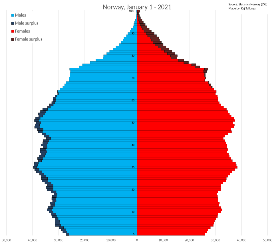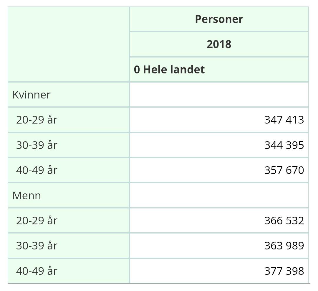 Grendel Skrevet 21. mars Skrevet 21. mars (endret) nachnoo skrev (10 timer siden): Det er 50,1% menn og 49,9% kvinner i alderen 20-66 år. Nei. Det er 6% flere menn enn kvinner opp til 50 år. Endret 21. mars av Grendel 0 Siter